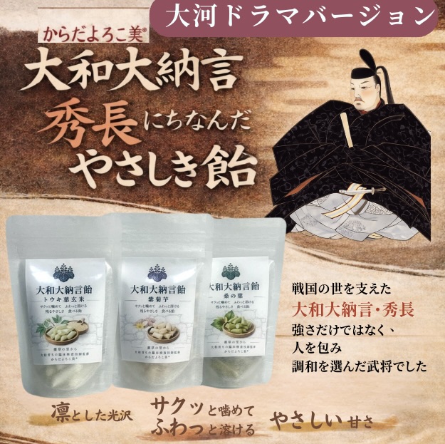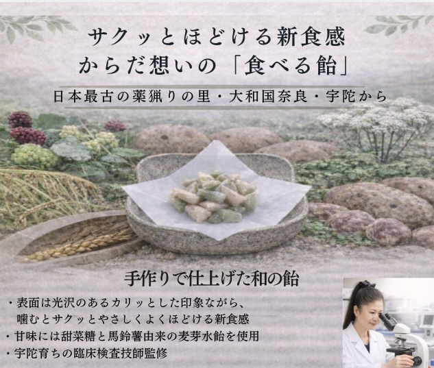 この飴は、生薬の医薬品以外の部位を食品として活用するための開発研究から生まれた商品です。
